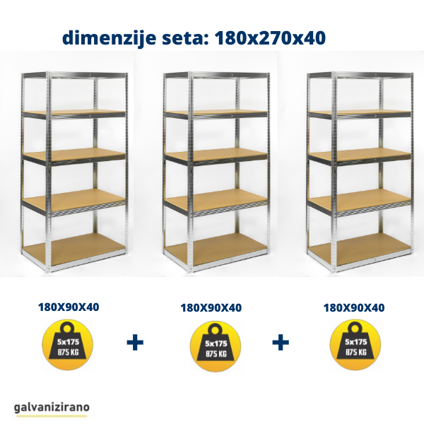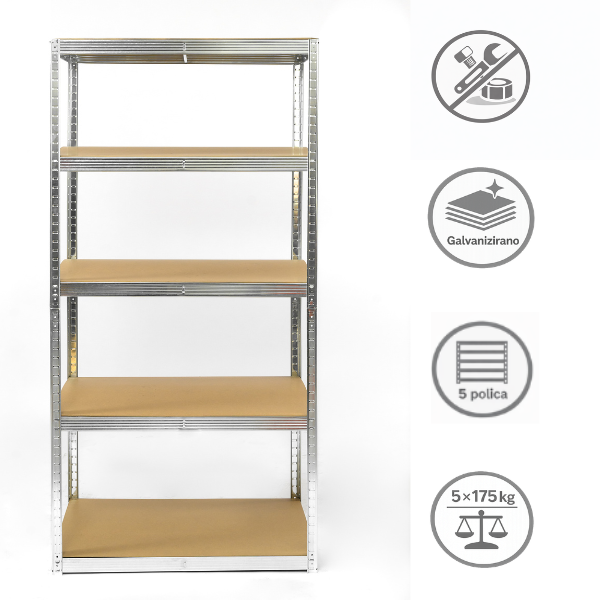 Polica ima 5 nivoa, a svaka polica nosivosti je do 175 kg, što omogućuje ukupnu nosivost do 875 kg raspoređenog opterećenja. Konstrukcija je galvanizirana, što osigurava otpornost na koroziju i dug vijek trajanja.