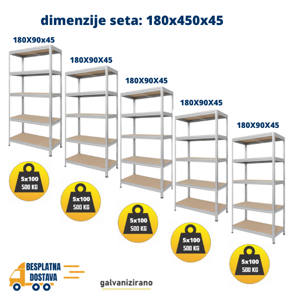 5 POLICA Metal-medijapan 180x90x45cm 5x100 kg - Dimenzije 180x450x45